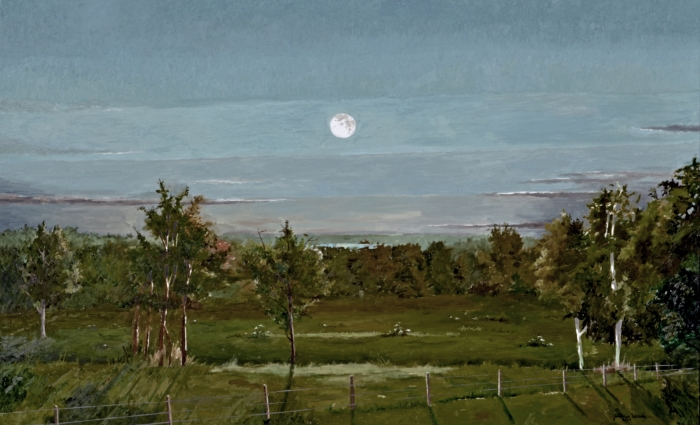 North Carolina artist J. Chris Wilson\‘s Landscape Painting "Moon Rising over the Pittsboro Exchange, Chatham County" from "From Murphy to Manteo—An Artist\‘s Scenic Journey"