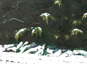 North Carolina artist J. Chris Wilson\‘s Landscape Painting Snow on Cedars see also "From Murphy to Manteo—An Artist\‘s Scenic Journey"